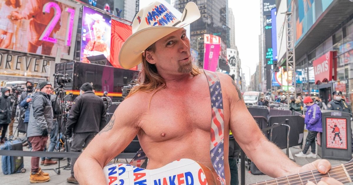 Robert Burck, le Naked Cow Boy New Yorkais arpente les rues de Times Square en slip, bottes et chapeau, qu'il pleuve, qu'il vente, qu'il neige, comme en ce moment.